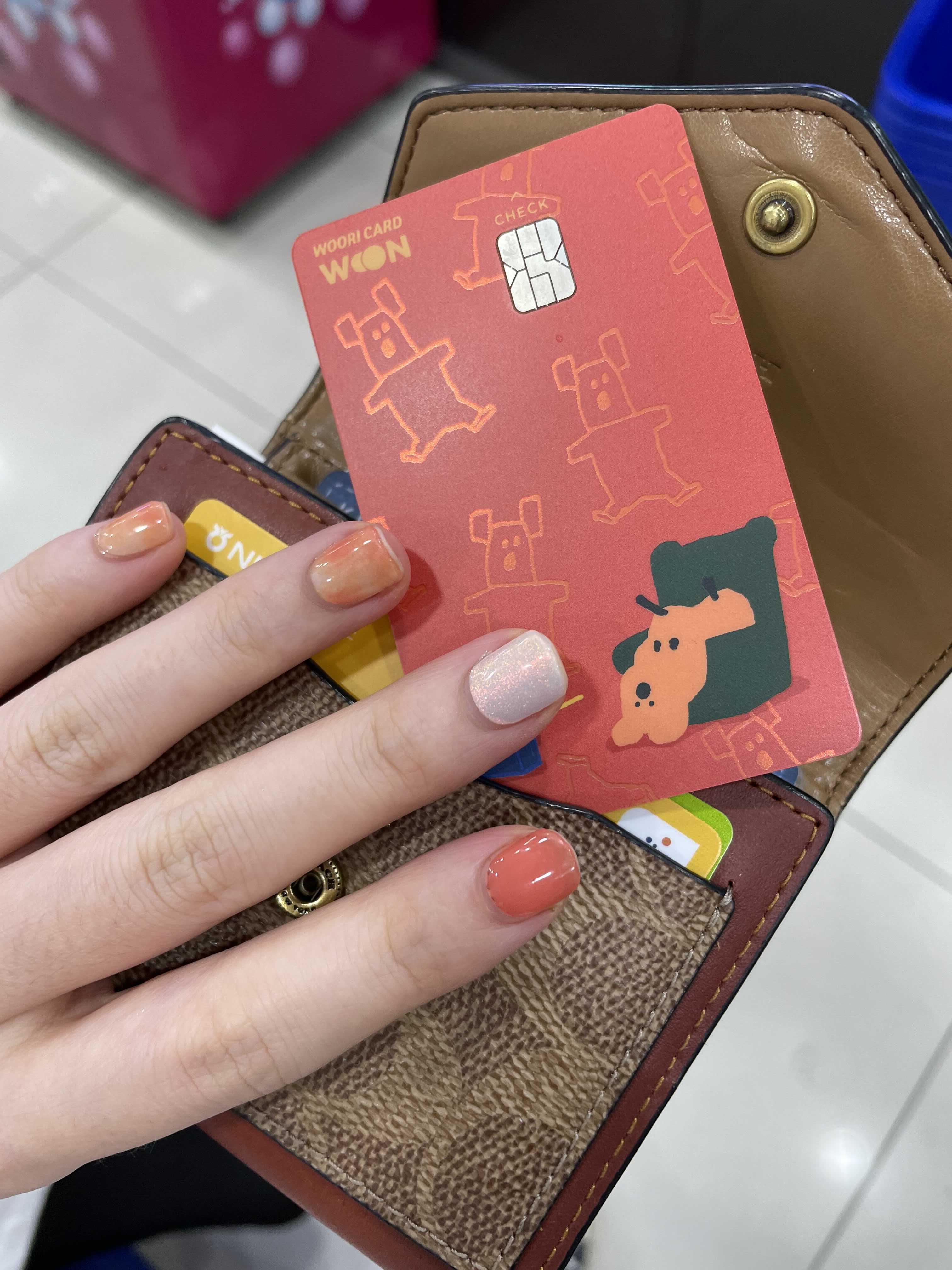 짜증나는 청바지 카드 보기 싫어서 우리체크 발급받앗음 짱 귀여운 쿼카임 색깔도 주황색 맘에들었음 🌸